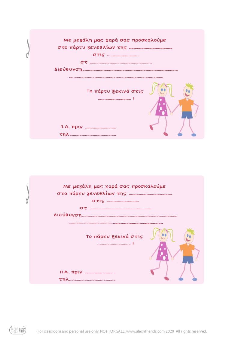Επιλέξτε την αγαπημένη σας, εκτυπώστε τη και βοηθήστε το παιδί να τη συμπληρώσει μόνο του — μια γλυκιά ευκαιρία για να εξασκηθεί στη γραφή και να συμμετέχει ενεργά στην προετοιμασία του πάρτι του.