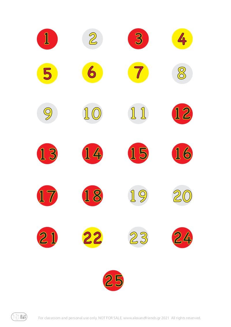 Using our Christmas tree, which is numbered up to 25, your little ones will learn to count their first numbers while also becoming aware of the passage of time. Print the tree and cut out the numbers. Together with your little ones, match the numbers one by one as the days go by. For a more beautiful result you can glue pom poms on each number you stick to make it look like your tree has colorful Christmas balls!