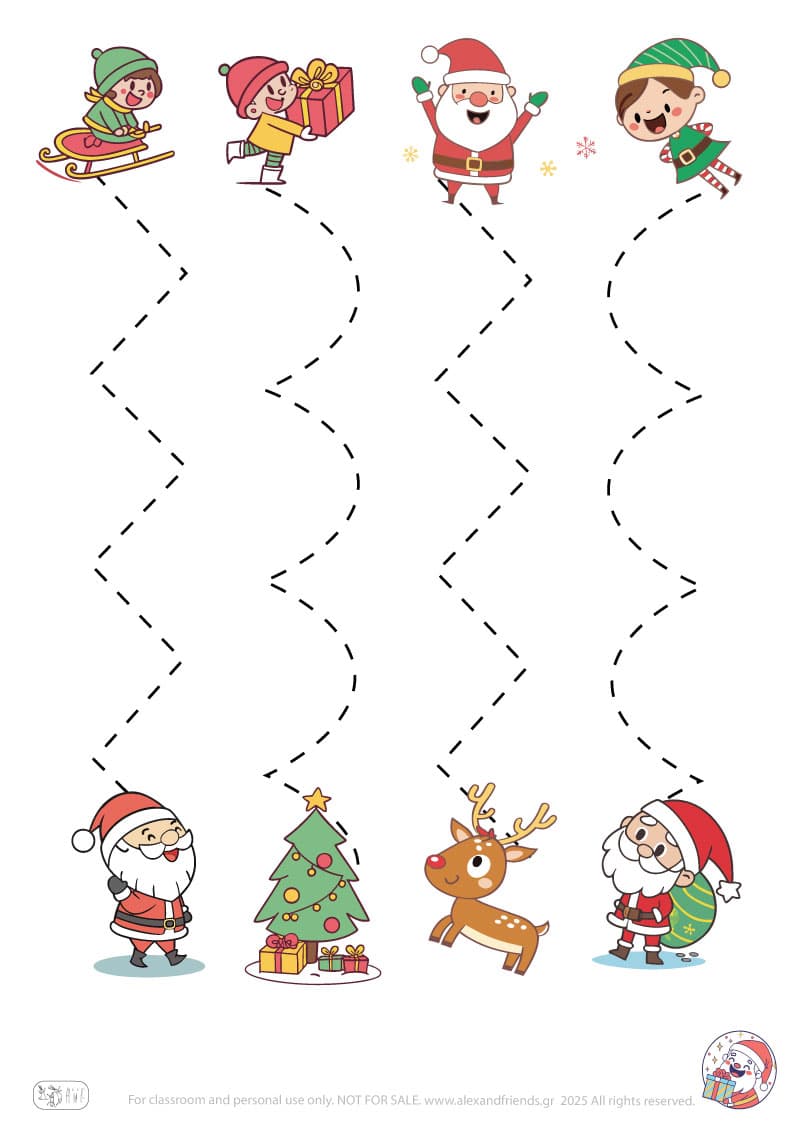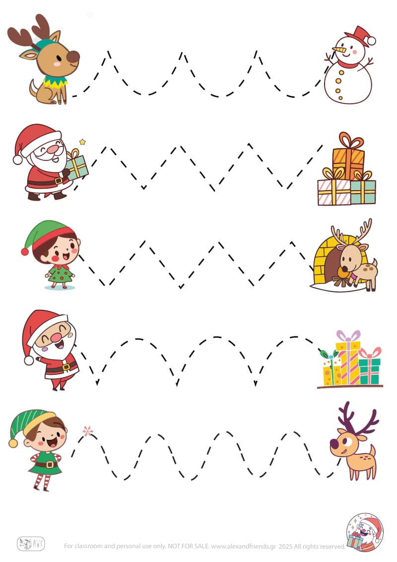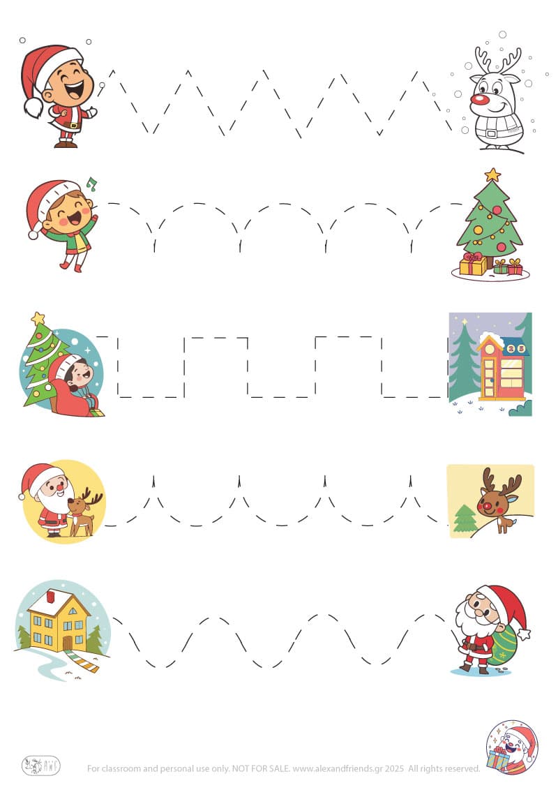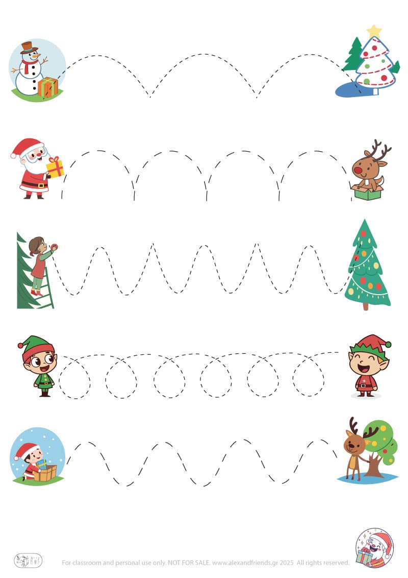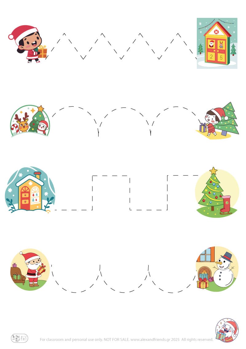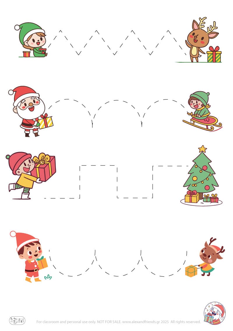 Christmas-themed pre-writing exercises offer a joyful and creative way for preschool children to develop early writing skills. Through activities such as tracing Christmas shapes (trees, stars, ornaments, presents), following lines or patterns with festive designs, children strengthen their fine motor skills and hand–eye coordination.