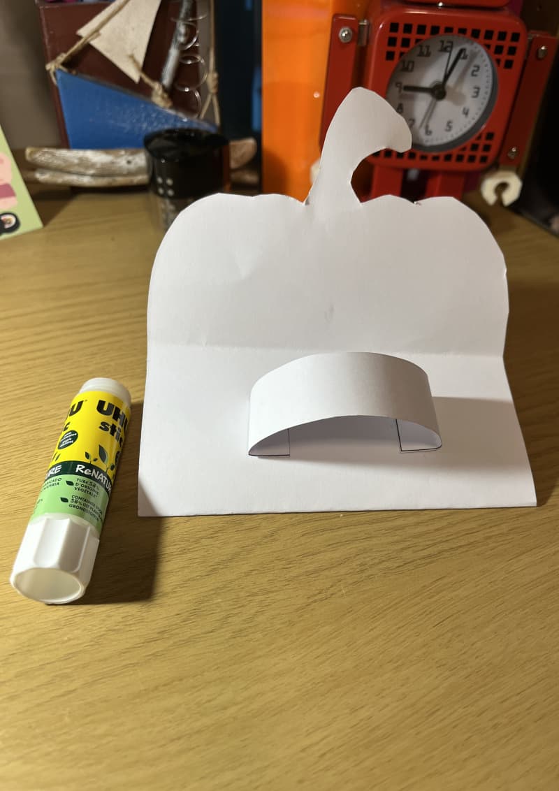 Step 3 — Make the handles From two separate paper strips that children cut themselves, they make the "handles": glue one on each side of the folded back of the mouth, left and right.