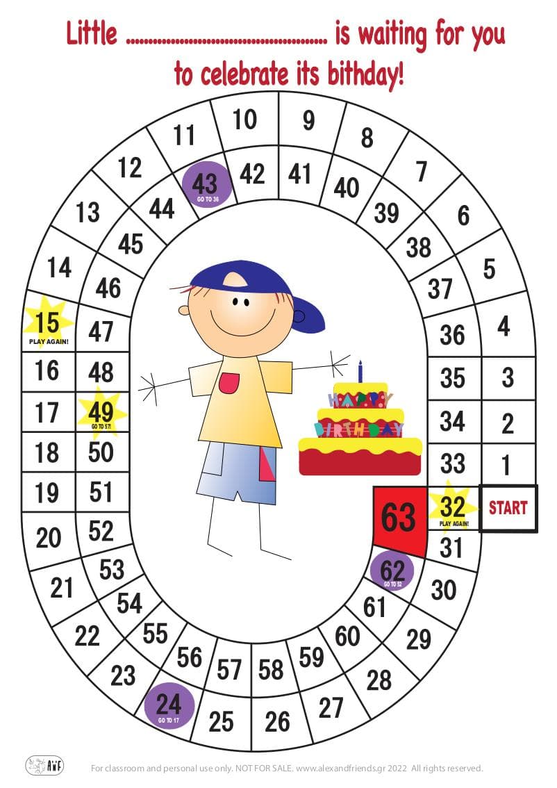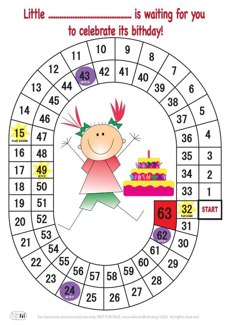 You will need only a simple printout of the game, 2 or more board pieces that your little ones can choose among their smallest toys and one or two dice. You can use your own, or print the ones found in our website.