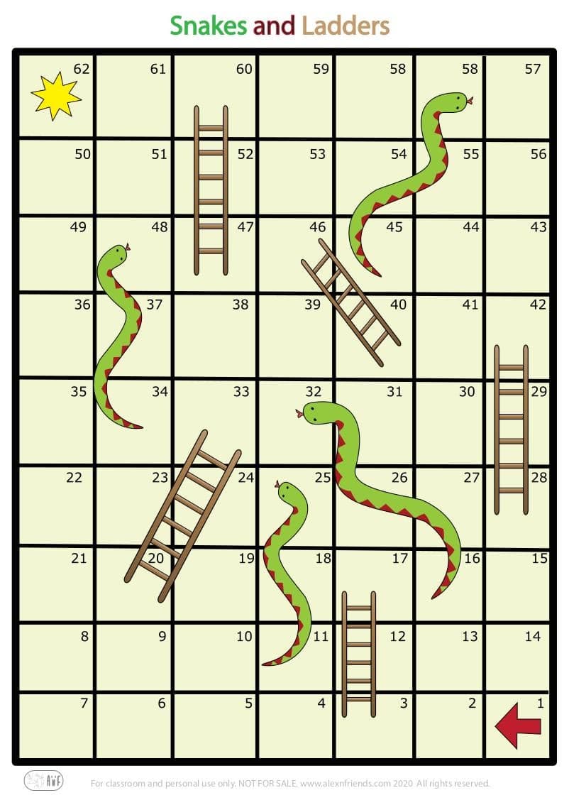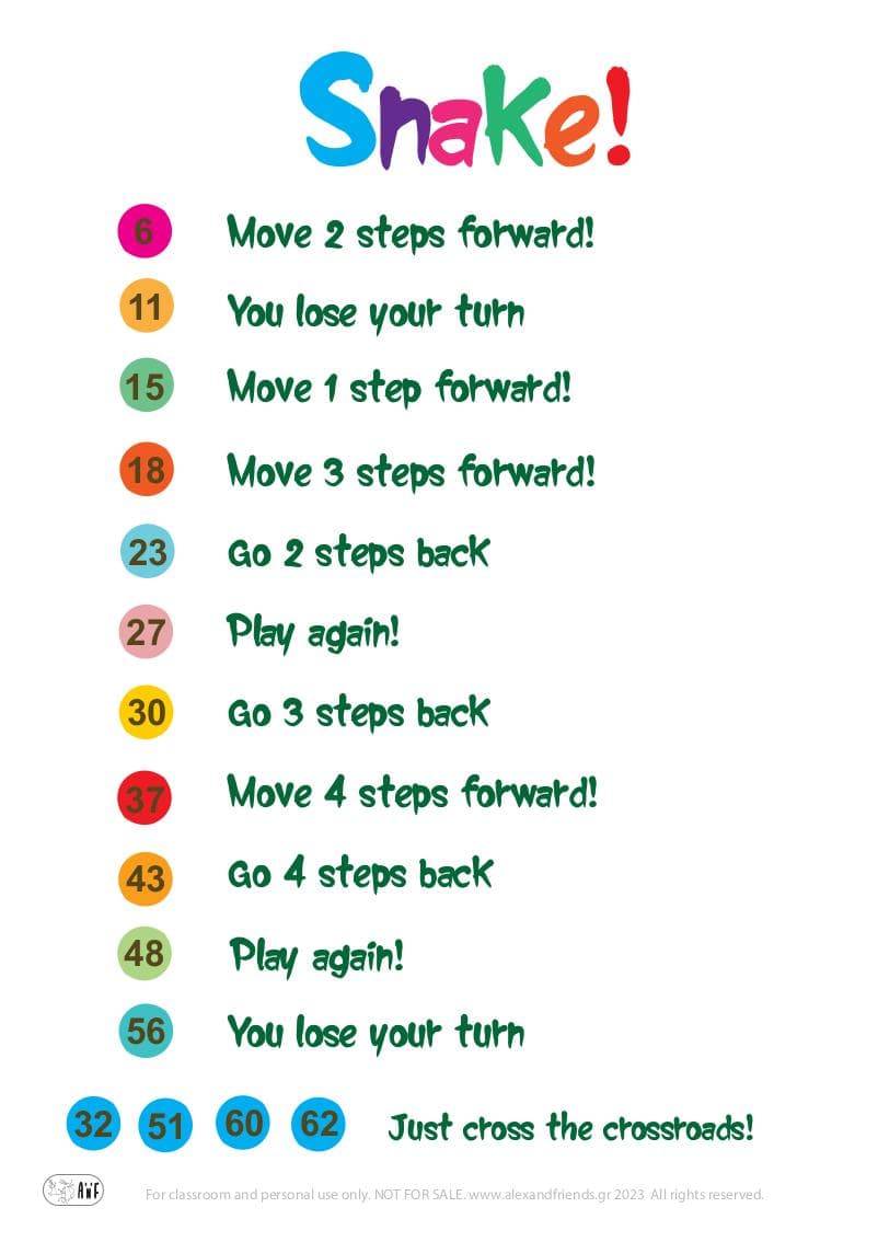 For these board games, the movement rules are visible on the games themselves. For the Panda game, the yellow and blue stars along with the purple circles display instructions. For the Snakes and Ladders game, the snakes and the ladders dictate how the player should move.