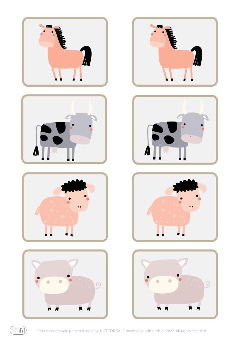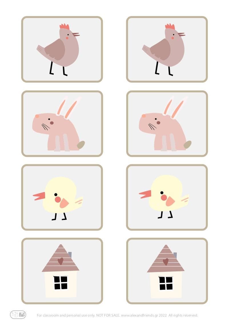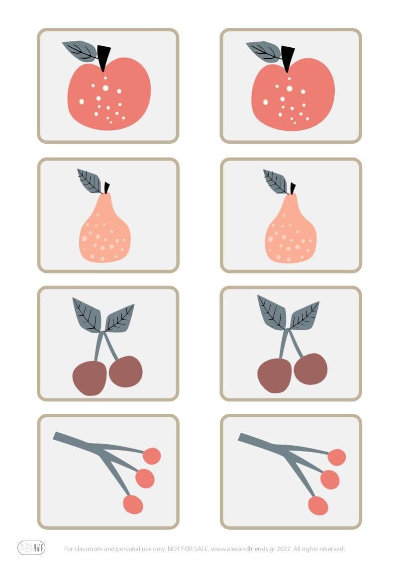 Version 2 — Open matching: For very young children, spread the cards face up and ask them to find the pairs. An easier version that focuses on observation skills.