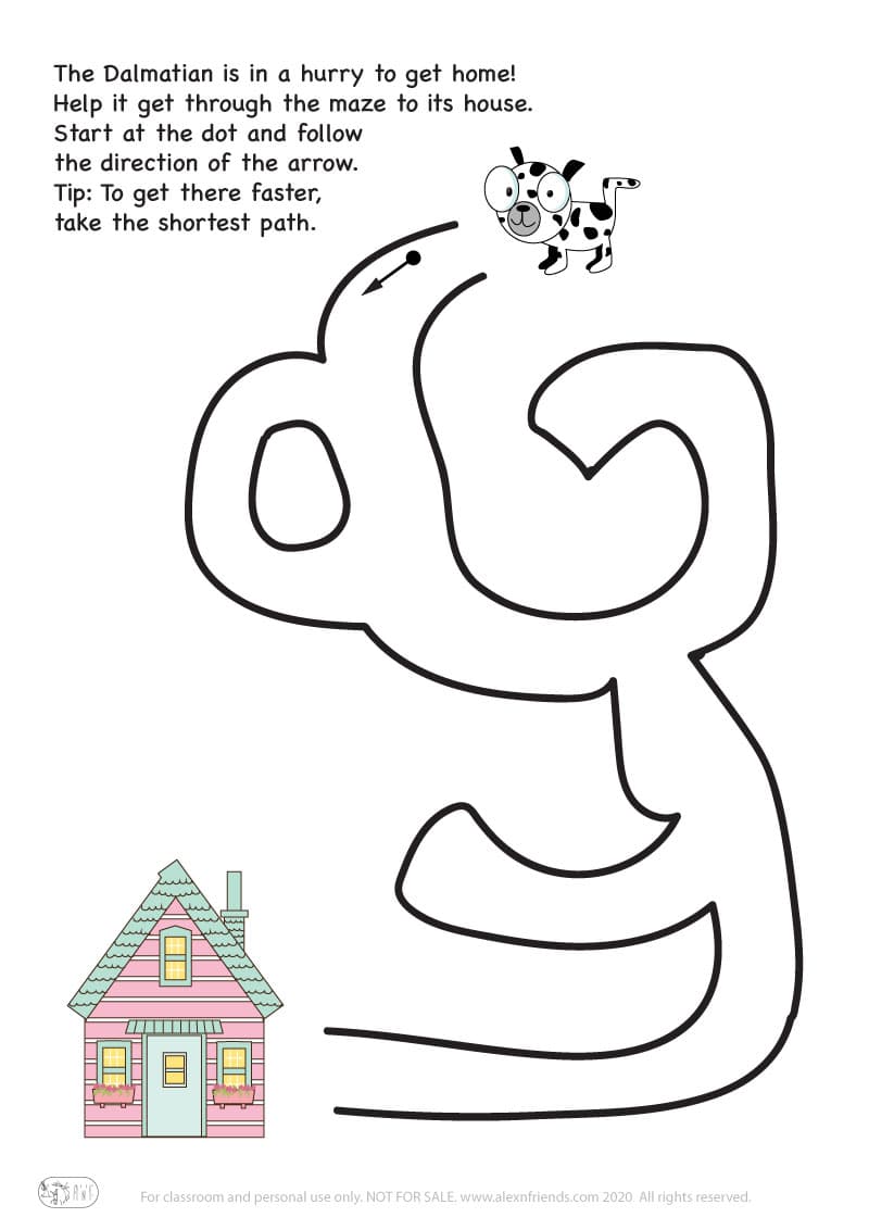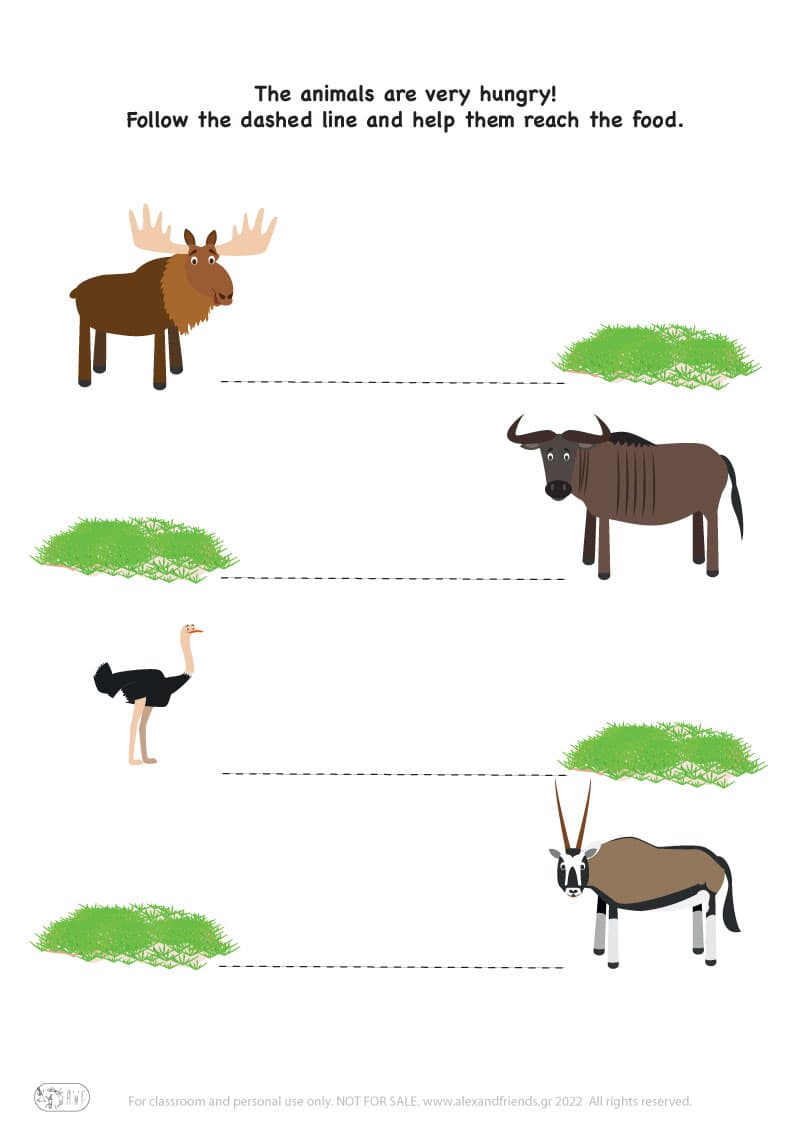 These exercises also offer the joy of playing, as in the first one your little ones try following the dotted line to help the animal reach its food, in the second they learn the shapes in a fun way while in the last one they complete and discover the images, which they can then paint as they wish!